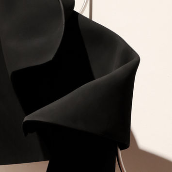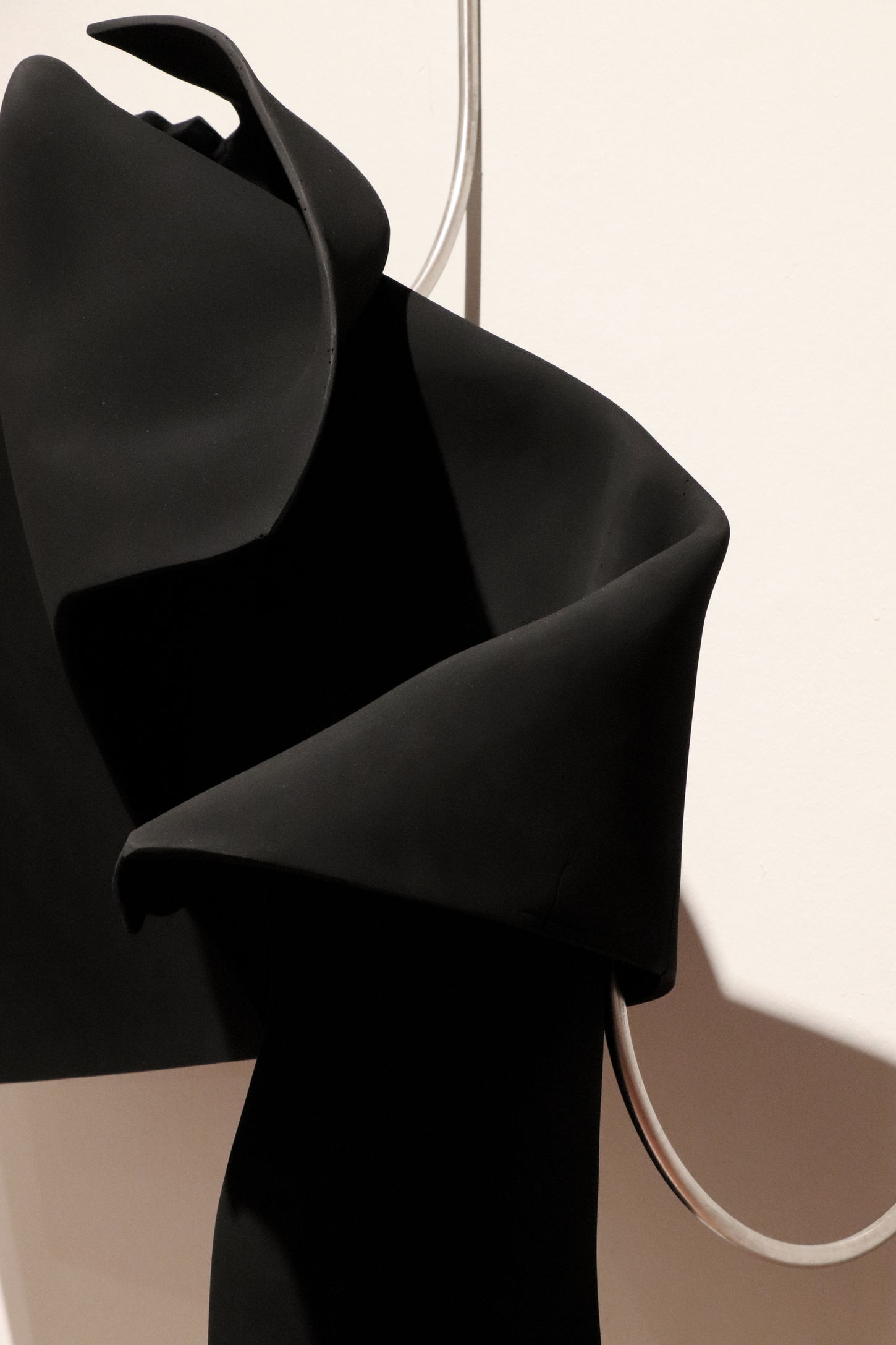 La obra es producto del encuentro material con la estructura acrílica de un paradero, posterior a una manifestación en el centro de Santiago. Ya deformado por el fuego, el objeto es sustraído de su lugar de origen, y borrados sus signos, se convierte en un vacío de sí mismo. La pintura negra utilizada absorbe mucha luz y además genera una ambigüedad material que resalta su silueta y distorsiona la noción de volumen.