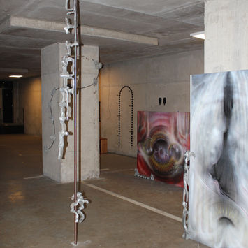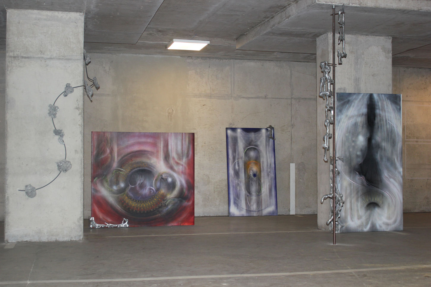 Trabajo colectivo con la artista Soledad Ramirez donde tres de sus pinturas se unen, se sostienen y complementan en torno a soportes y piezas escultóricas de aluminio fundido. Desde el ensamble ocurre una simbiosis entre el lenguaje de cada una, formando un conjunto instalativo.